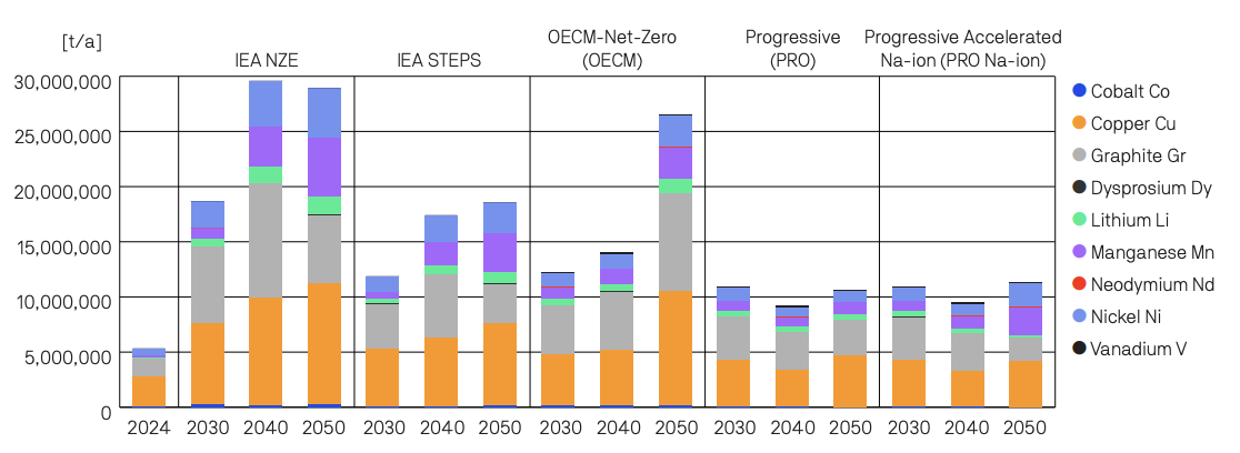 - グリーンピースの3つのシナリオのうち、進歩的シナリオ(PRO)では、OECMネットゼロシナリオよりも鉱物需要量が少なくなる。これは、OECMでは2050年までに世界の自動車登録台数が20億台に達すると想定しているところ、進歩的シナリオでは同台数を16億の想定にしているためである。さらにリサイクル率を上昇させることで、進歩的シナリオでは、バナジウム以外の鉱物の需要量は減少する。