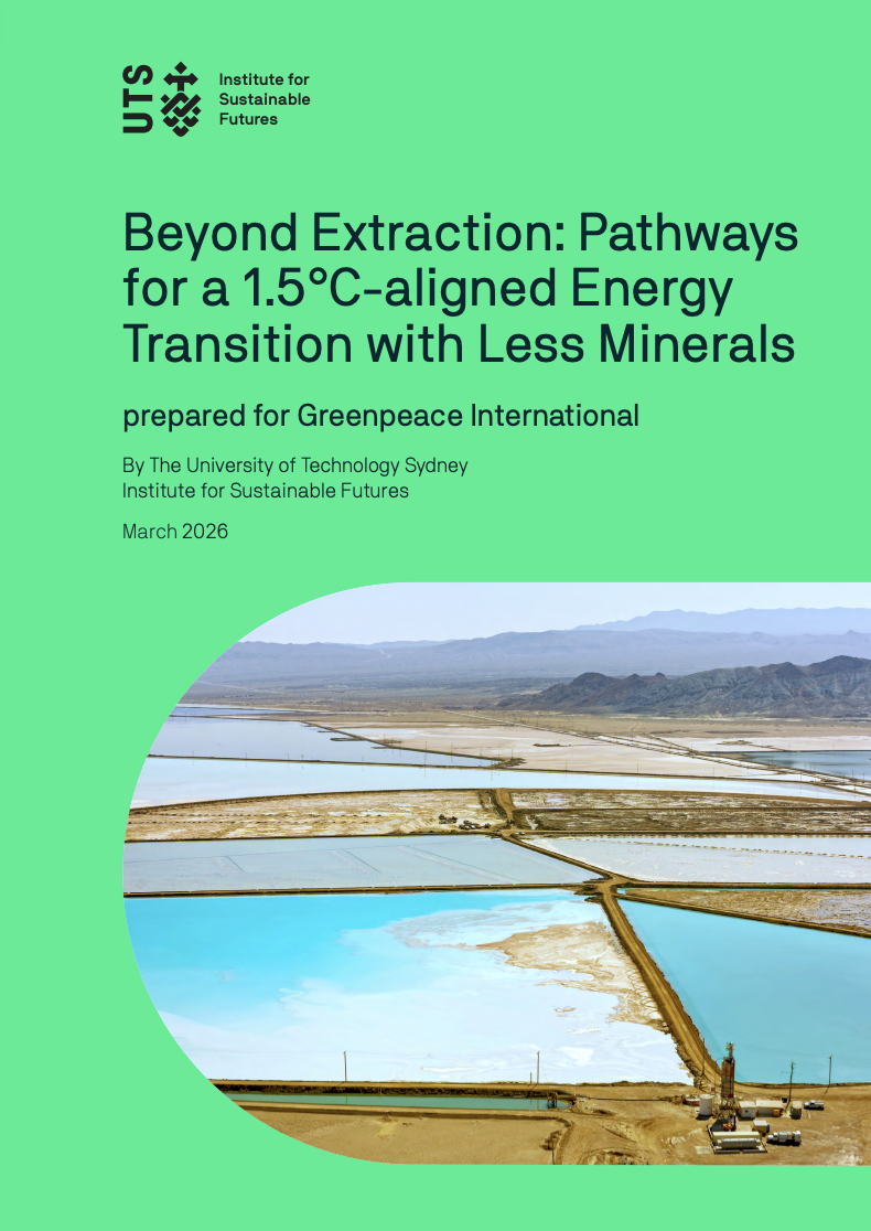 国際環境NGOグリーンピース・インターナショナル(本部・アムステルダム)は3月17日、シドニー工科大学(オーストラリア)の持続可能な未来研究所(ISF)と提携し、交通部門の脱炭素に必要とされる再生可能エネルギーの拡大と備蓄のために不可欠な鉱物資源の需要を予測する報告書『Beyond Extraction: Pathways for a 1.5°C-aligned Energy Transition with Less Minerals』を発表しました。本報告書では、これまで発表されている鉱物需要予測とは異なり、最新の電池技術の革新状況を反映し、需要を最小化させる戦略を分析に含めている点が特色です。公共交通機関の充実や鉱物のリサイクルの強化、先進的なバッテリー技術の拡充により、鉱物採掘を最小限にとどめ、地球の生態系を維持しながらクリーンエネルギーへの転換を実現する可能性を提示しています。