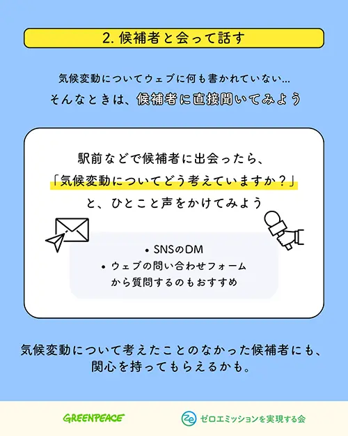 意外に効果的なのが、選挙の立候補者に気候変動対策についてたずねること。住民の1票がかかっていれば、耳を傾けてくれます。事務局では、選挙のたびに市民ができることをオンラインイベントやSNSで呼びかけ、選挙後も次回に活かすために学びを共有し合います。