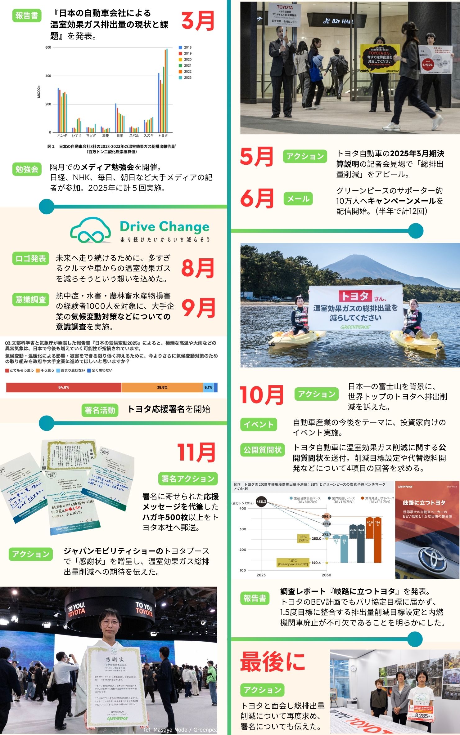 このような目標のもと、2025年は、世界で最もクルマを販売しているトヨタ自動車さんに、パリ協定で合意されている1.5℃に抑える道筋に沿った温室効果ガスの総排出量の削減目標を発表してもらうことを目指して活動を行いました。