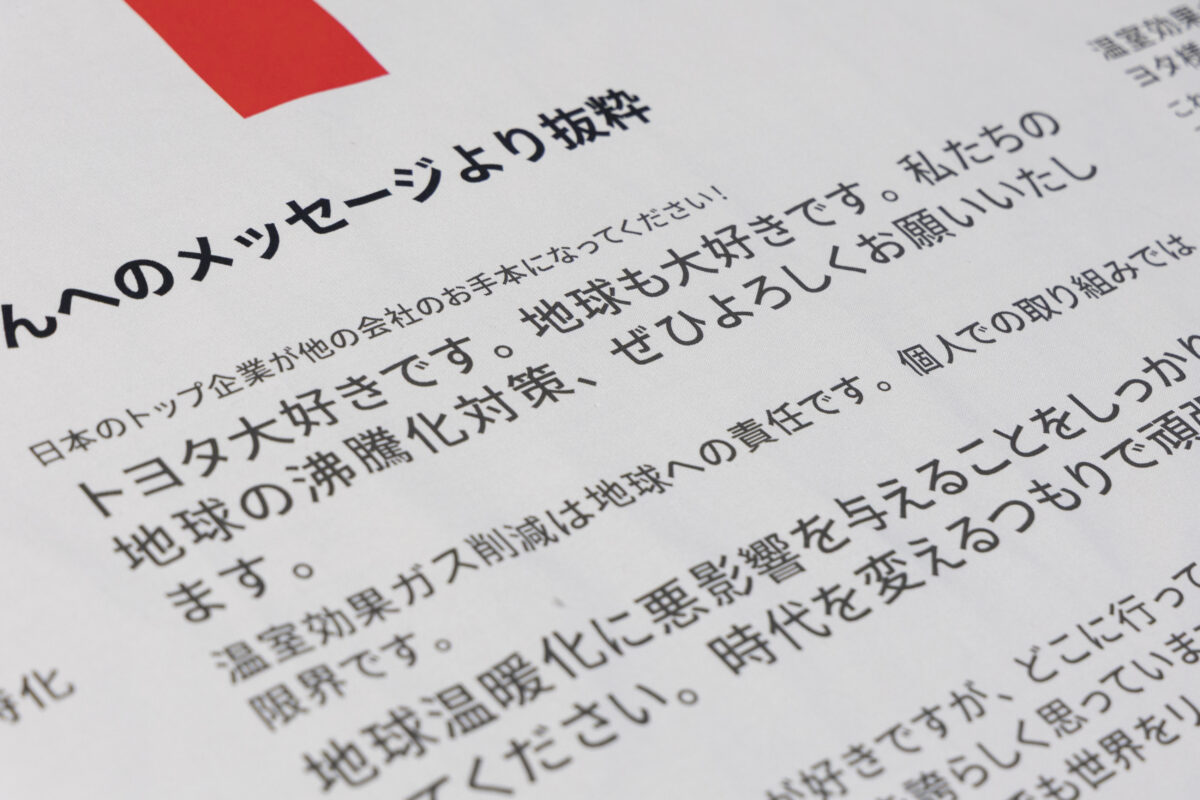 計4回行ったアクションでは、一貫してトヨタさんの総排出量削減をアピールしました。