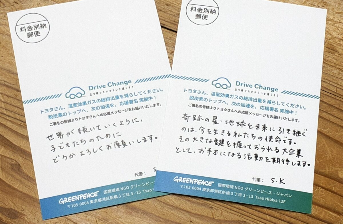 グリーンピースが推進する自動車の脱炭素キャンペーン「Drive Change」では、世界トップクラスのシェアを誇るトヨタ自動車さんに「期待」と「応援」の気持ちを込めた「応援署名」を呼びかけました。「脱炭素分野でもリーダーシップを発揮してほしい」「総排出量削減の具体的な目標を示してほしい」との思いで9月末に開始した署名には、世界中から8000筆以上が集まり、800件を超えるメッセージも届きました。