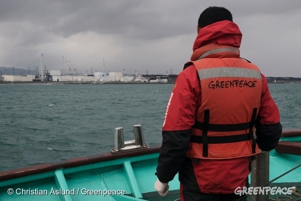 「虹の戦士号」から見えた2キロ先の福島第一原発は、5年前と同じくらい、悲惨な状態にあるように私の目には映りました。飯舘村や浪江町などの住民が避難している地域では、除染作業で剥ぎ取った汚染土がつめられたおびただしい数の袋が仮置き場や道沿いに並べられています。