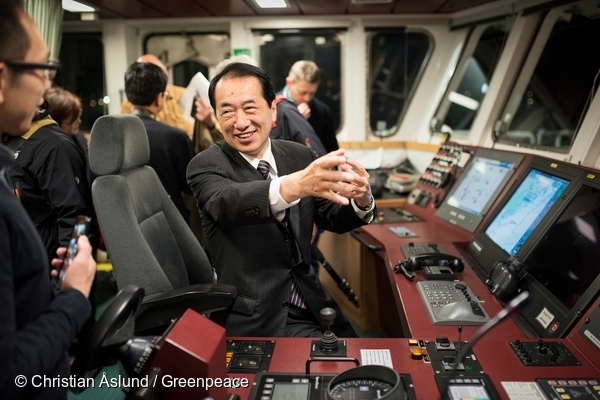 (写真)虹の戦士号で福島沖を航行する菅直人元首相。日本のエネルギー政策は、原発から自然エネルギーに舵を切るべきであると改めて訴えた