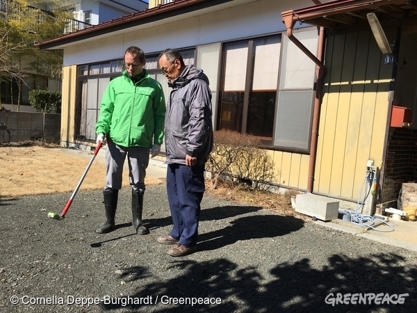 (写真)グリーンピースの放射線専門家が放射線測定を行っている様子。福島第一原発事故後、飯舘村から避難した農家の菅野晢さん宅にて