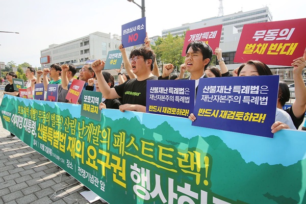 “산불특별법서 피해 지원은 살리되 난개발 특혜는 막아야” 본회의 통과된 산불특별법, 보호지역 해제와 산림 난개발로 이어질 조항 다수 포함 산불 피해지역, 전면적인 개발보다 실질적인 구제책으로 구성되어야 (2025년 10월 2일) 초대형 산불 피해 주민 구제를 표방한 법안에 보호지역 해제와 산림 파괴로 이어질 수 있는 조항들이 다수 포함된 사실이 확인돼, 80여개 환경단체와 일부 조계종 사찰들이 반발하고 나섰다. 산청·안동·경남…
