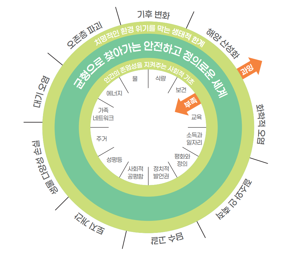 도넛경제학은 경제를 새롭게 상상해보는 아이디어입니다. 도넛의 바깥 경계는 생태 한계선을, 도넛의 안쪽 경계 내부는 인간의 사회적 기초를 상징합니다. 인간이 모두 도넛의 안쪽과 바깥쪽이 아니라 도넛 위에 살려면, 환경을 해치지 않으면서도 사회적 기본을 보장하는 경제가 필요합니다. 쉽게 말해 환경과 사회 문제를 동시에 해결해야만 우리의 행복한 미래가 가능하다는 뜻입니다.