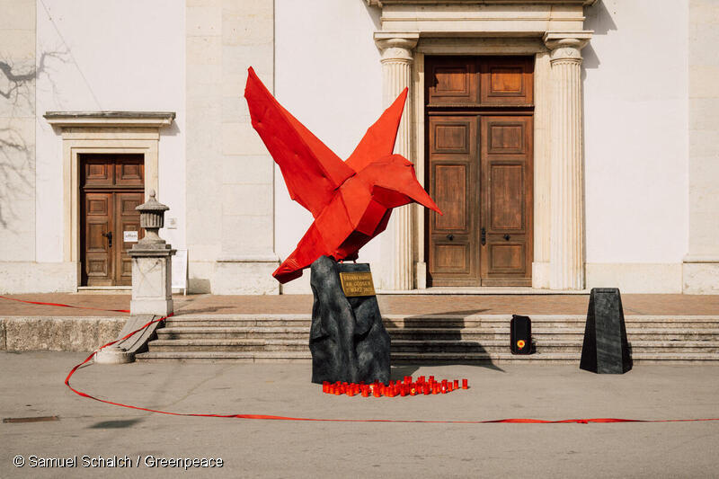 2026년 3월 7일, 그린피스 활동가들은 수많은 봉사자들과 함께 고스겐 원전 중심으로 반경 5km에 걸쳐 붉은실로 원을 그려 원전 사고 발생 시 극심한 피해를 입을 공간을 보여주고, 원전 사고 피해자 추모의 상징으로 붉은 물총새 조형물을 설치했습니다.