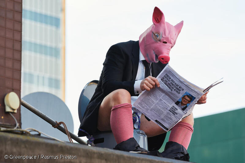 검은 정장을 입고 돼지 가면을 쓴 ‘돼지 활동가’가 덴마크 농업식품협회 본부 옥상에 놓인 변기에 앉아있습니다.