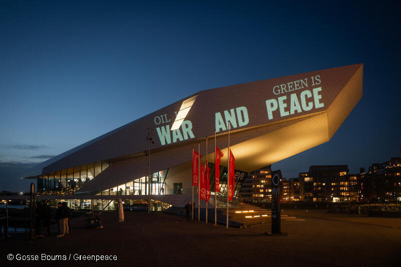 암스테르담에서 그린피스는 화석연료 이익을 노린 전쟁에 반대하며 아이 필름뮤지엄에 “석유는 전쟁이고, 녹색은 평화다(Oil is War and Green is Peace)”라는 문구를 투사했습니다. 이 액션은 고유가 문제를 논의하기 위한 의회의 토론이 열리기 전날 진행되었습니다.