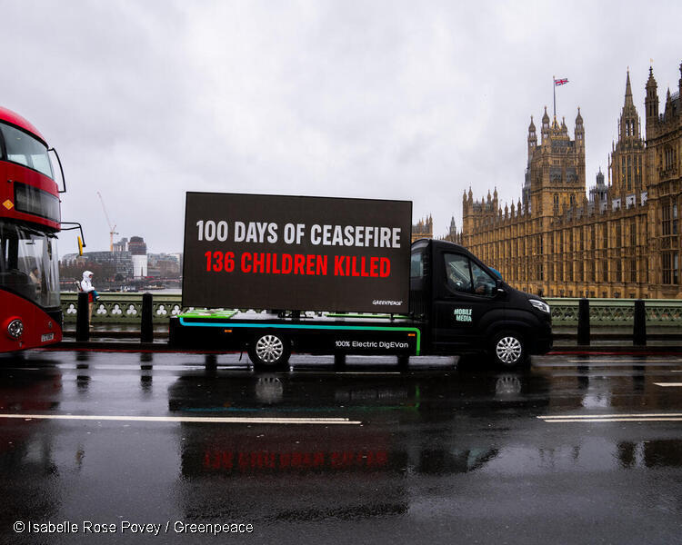 그린피스 UK, 전광판 트럭이 런던 웨스트민스터 일대를 돌며 휴전 100일이 지난 지금도 가자에서 계속되는 죽음과 폭력을 알리고 있다. © Isabelle Rose Povey / Greenpeace © Isabelle Rose Povey / Greenpe