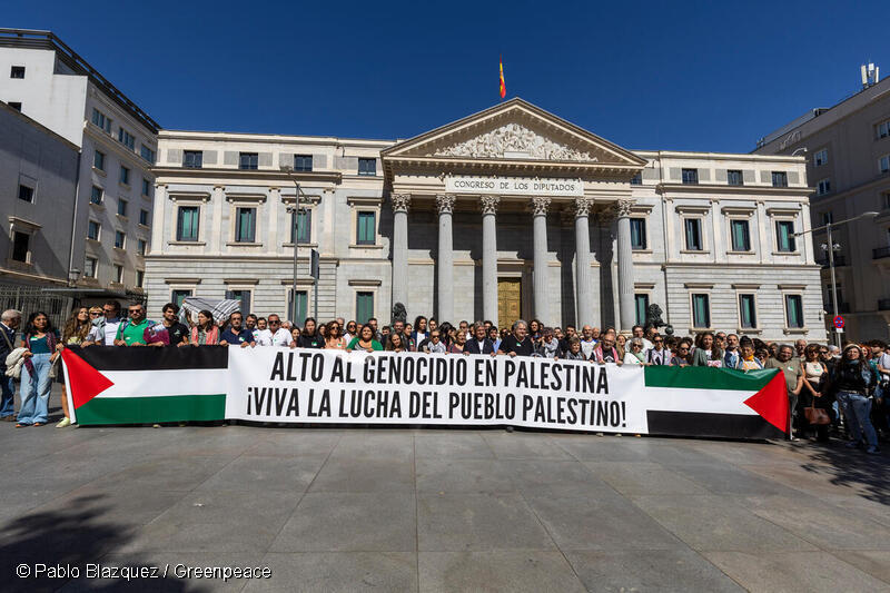 스페인 마드리드에서 열린 '비욘드 그로스(Beyond Growth)' 컨퍼런스 앞. 시위대가 국회의사당 계단에서 이스라엘 해군의 공격에 맞서는 글로벌 수무드 플로틸라를 지지하며 가자 제노사이드 피해자들과의 연대를 표하고 있다. © Pablo Blazquez / Greenpeace © Pablo Blazquez / Greenpeace