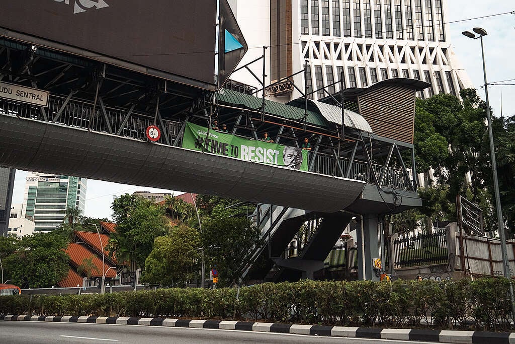 KUALA LUMPUR – A day before the arrival of United States President Donald Trump, activists from Greenpeace Malaysia stage a non-violent banner action, calling for Malaysia and ASEAN leaders to uphold integrity and justice in the face of the hypocrisy of climate denial and genocide.