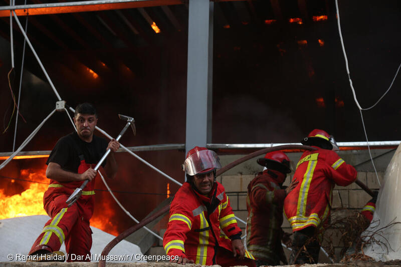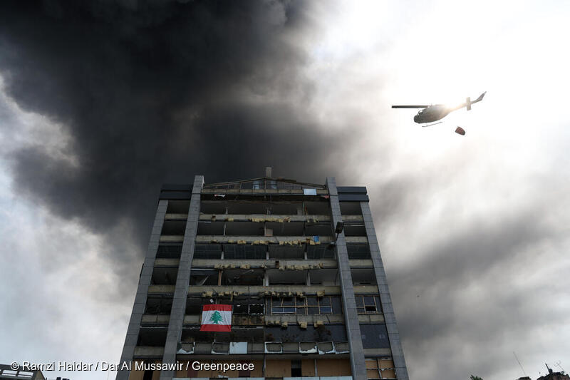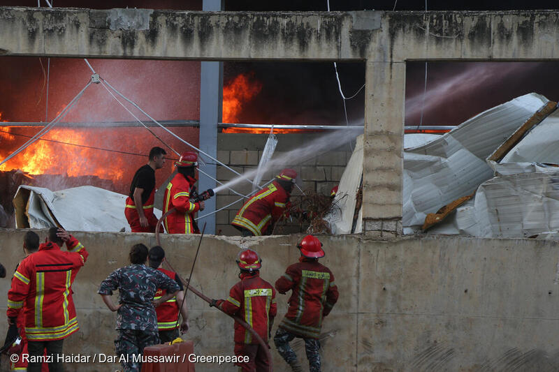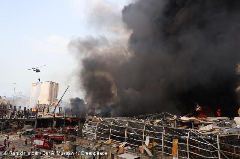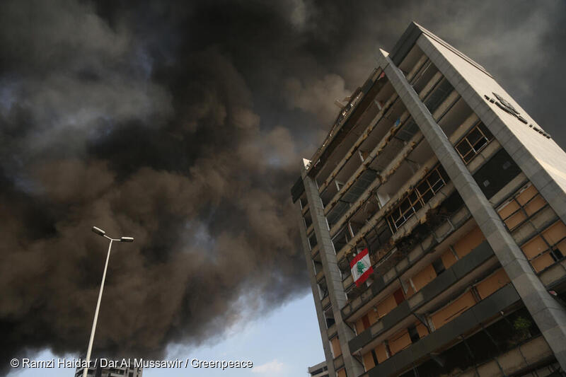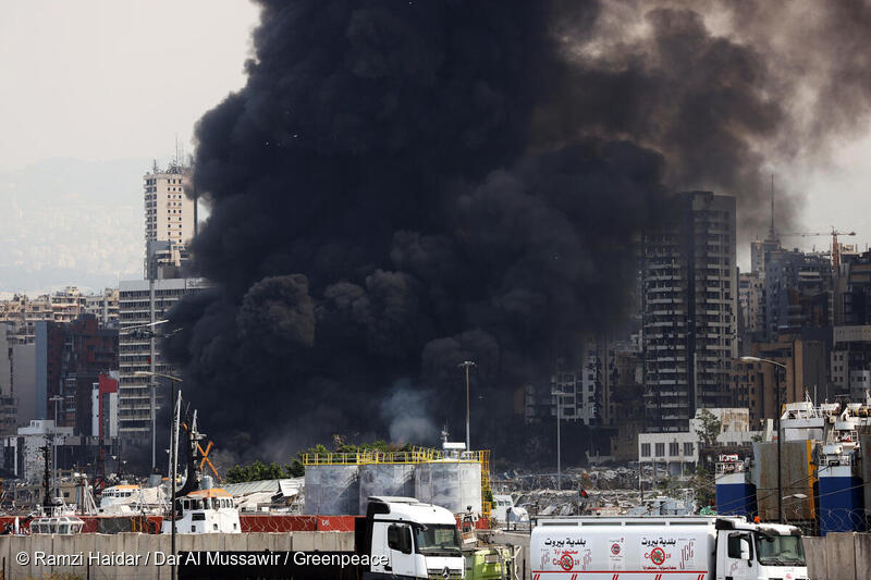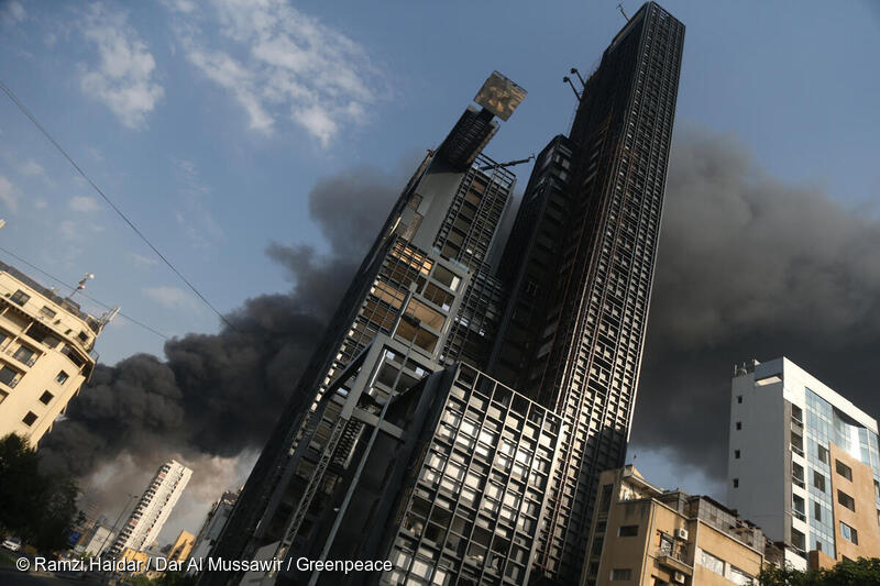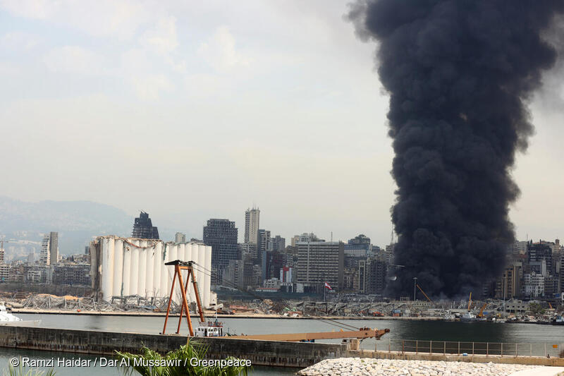 توضح غرينبيس، بناء على المعلومات المتداولة حول السبب وراء الحريق المشتعل في مرفأ بيروت، ان ينتج عن حرق الإطارات جسيمات دقيقة ودخان مرئي ورماد، ولكن أيضًا الكثير من الملوثات العضوية المتطايرة التي يمكن تنشقها حتى خارج نطاق الدخان. وقد يحتوي الدخان مركبات شديدة السمية مسببة للسرطان، غالباً ما تكون هذه الجسيمات من المركبات العضوية المتطايرة والكربون الأسود وغيرها من الغازات الحمضية مثل ثاني أكسيد الكبريت. وعليه تنصح غرينبيس جميع سكان منطقة بيروت ومحيطها البقاء في المنزل وإبقاء النوافذ مقفلة والابتعاد عنها وعن الشرفات، والالتزام بوضع الكمامات.