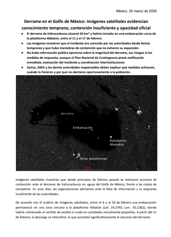 Imágenes satelitales muestran que desde principios de febrero pasado se realizaron acciones de contención ante el derrame de hidrocarburos en aguas del Golfo de México, frente a las costas de Campeche. En esos días, las organizaciones alertamos ante la falta de información y la respuesta insuficiente de las autoridades.