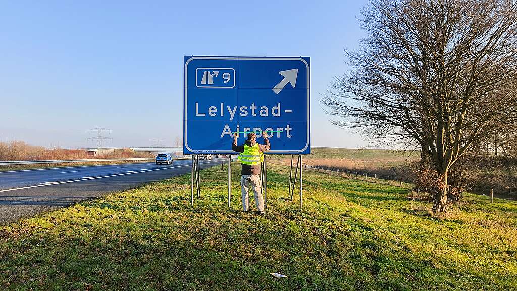 Het gaat om verkeersborden langs de A6 en onder andere de Anthony Fokkerweg richting het vliegveld. Het woord ‘Airport’ of het vliegtuiglogo is afgeplakt met groene tape.  “Op deze manier zetten wij symbolisch een streep door het vliegveld, omdat de politiek dit niet durft. D66 had nota bene expliciet in het verkiezingsprogramma opgenomen dat Lelystad Airport niet open zou gaan. Daarom zijn we enorm teleurgesteld en voeren we nu actie. Want de natuur, het klimaat en ook heel veel mensen in de wijde omtrek krijgen hier last van en zitten helemaal niet te wachten op dit vliegveld,” zegt Lemm.