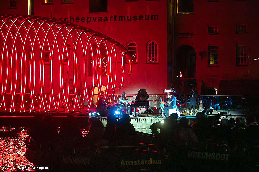 Pianist en componist Iris Hond gaf vanavond een indrukwekkend concert op een ponton in het water bij Het Scheepvaartmuseum. Met een speciaal samengestelde performance vierde zij, samen met Amsterdam Light Festival, Greenpeace en Het Scheepvaartmuseum, de inwerkingtreding van het baanbrekende wereldwijde oceanenverdrag. Het concert vond plaats bij het kunstwerk ‘Whale Fall’, dat als symbolisch decor diende voor de verbinding tussen mens, kunst en natuur.