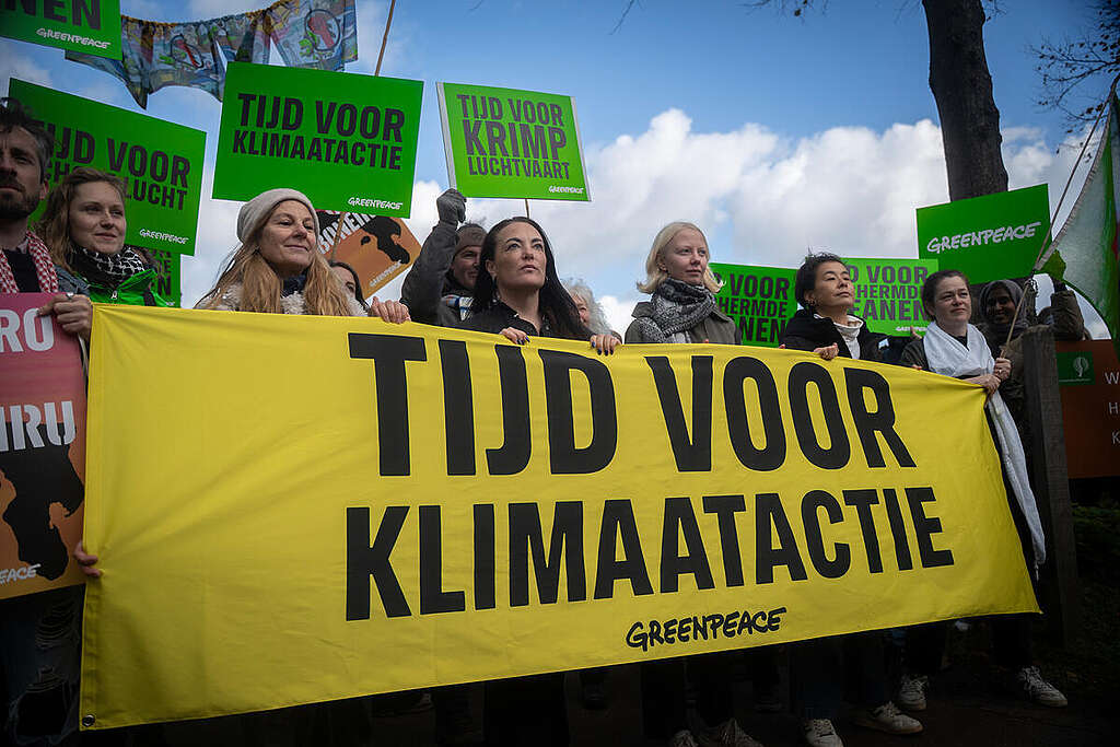 Greenpeace-activisten protesteren met een groot spandoek op de reclamezuil op Schiphol, met de tekst: KLM, je vliegt alle klimaatgrenzen voorbij. KLM wil middenin de klimaatcrisis alleen maar meer gaan vliegen. Greenpeace eist een krimpplan en het schrappen van onnodige korte vluchten.