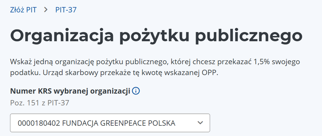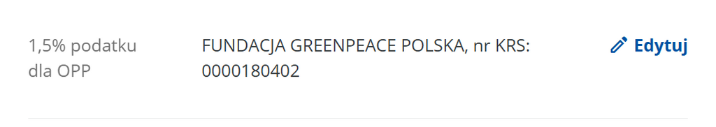Fundacja Greenpeace Polska to organizacja pożytku publicznego (tzw. OPP), co oznacza, że wszystkie osoby, które rozliczają podatek w deklaracji PIT36, PIT36L, PIT37 lub PIT38 mogą przekazać na naszą działalność statutową 1,5% swojego podatku dochodowego.