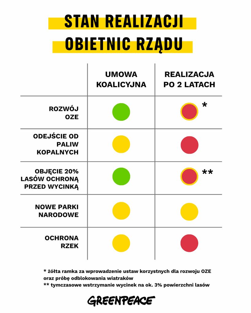 O ile w pierwszej ocenie planów i obietnic wyborczych koalicja premiera Donalda Tuska otrzymała od ekspertów i ekspertek Greenpeace całkiem pozytywne oceny, tak po dwóch latach tabela dotycząca realizacji obietnic świeci niemal cała na czerwono.