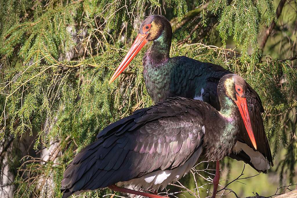 - Bocian czarny ma czarne upierzenie z zielono-fioletowym połyskiem i czerwone nogi oraz dziób.