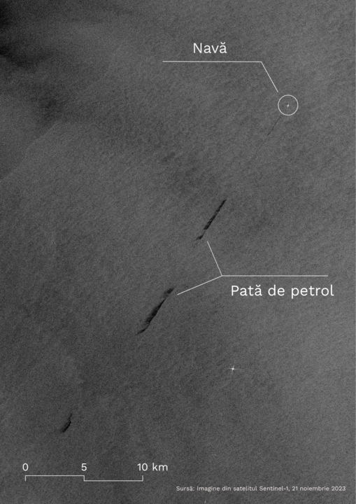 Cum putem să fim siguri – sau cu un grad ridicat de certitudine – că petele identificate de satelit pot fi atribuite unui nave? În imagine este prezentat un exemplu clar de deversare de la o navă, cel mai probabil deversare de apă uzată de santină.