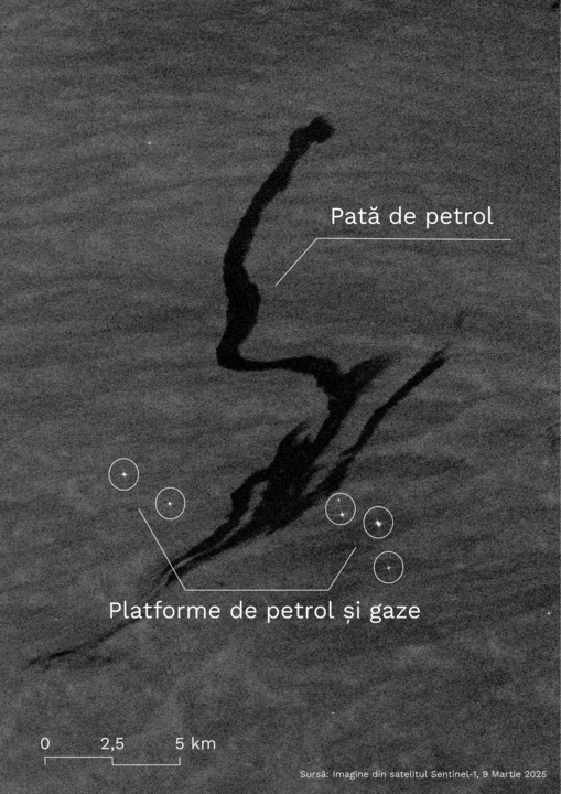 Conform datelor SkyTruth Cerulean, 226 de pete provenite din deversări cu surse diverse, cu o suprafață totală de 1308 kilometri pătrați au fost detectate pe suprafața Mării Negre în perioada 29.04.2022 – 11.09.2025.