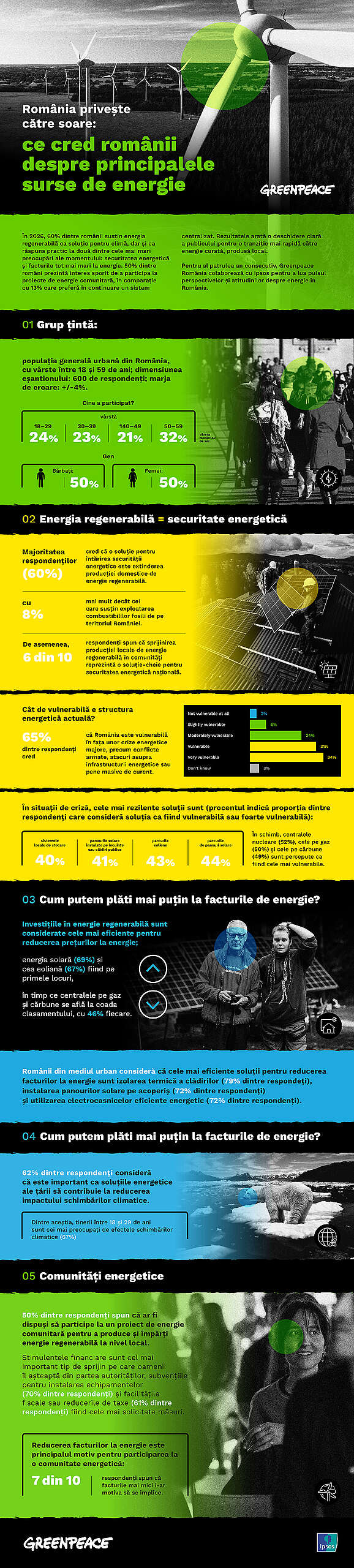 Conform celui mai recent studiu realizat de Ipsos la comanda Greenpeace România, 60% dintre români consideră că producția internă de energie regenerabilă reprezintă un element central pentru consolidarea securității energetice a țării.