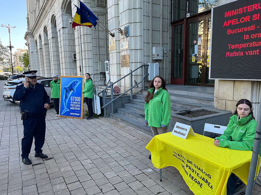 23 aprilie – BUCUREȘTI – Activiștii Greenpeace România au ocupat astăzi trotuarul din fața Ministerului Mediului, instalând o masă de discuții și un tablou reprezentând cele peste 67.000 de semnături ale cetățenilor pentru protejarea Mării Negre. Organizația a recurs la acest protest „maraton” după ce Ministerul a amânat timp de aproape un an audiența cerută de activiști, invocând „agende încărcate” și „sloturi neconfirmate”, deși solicitarea a fost depusă încă din iulie 2025. Această acțiune de protest vine și în contextul unei situații alarmante pe litoralul românesc, unde 23 de delfini au eșuat recent pe plajele din Constanța.