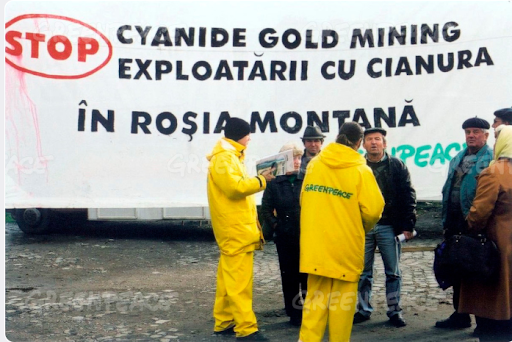 În ianuarie 2002, activiștii și comunitatea locală au protestat împotriva cianurării folosite pentru extracția de aur din mina de la Roșia Montană.