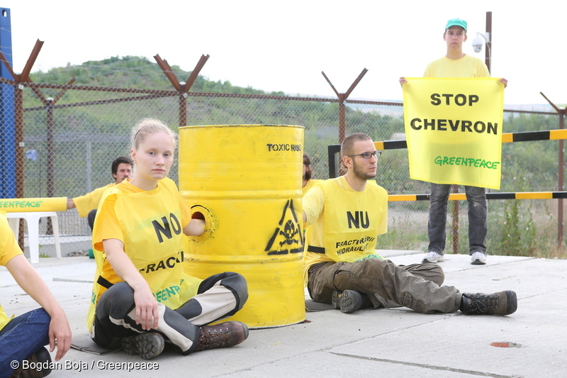 25 de activiști din 7 țări au protestat pașnic la Puiești și au declarat o zonă de carantină în jurul primei sonde de foraj a companiei Chevron pentru explorarea gazelor de șist. Activiștii au format un lanț uman la intrarea perimetrului Chevron.