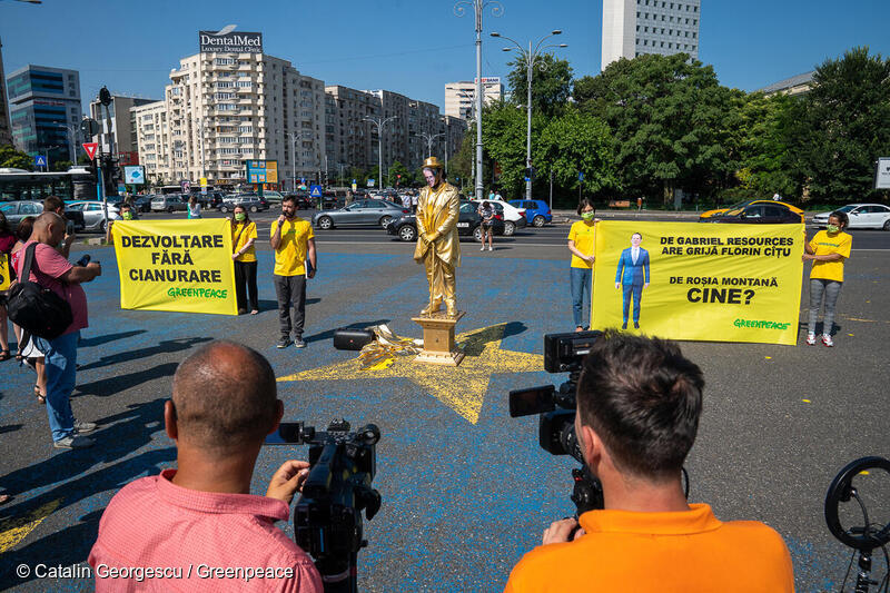 Greenpeace România a dezvelit o statuie aurită a fostului premier Florin Cîțu în timpul unei ședințe guvernamentale privind dosarul UNESCO Roșia Montană. Acțiunea a fost un protest față de declarațiile recente ale premierului.