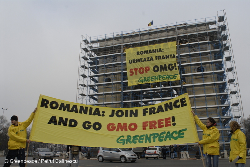 În timpul vizitei președintelui francez Nicolas Sarkozy în România, activiștii au afișat un banner pe Arcul de Triumf din București, solicitând guvernului român să interzică cultivarea porumbului modificat genetic (MG).