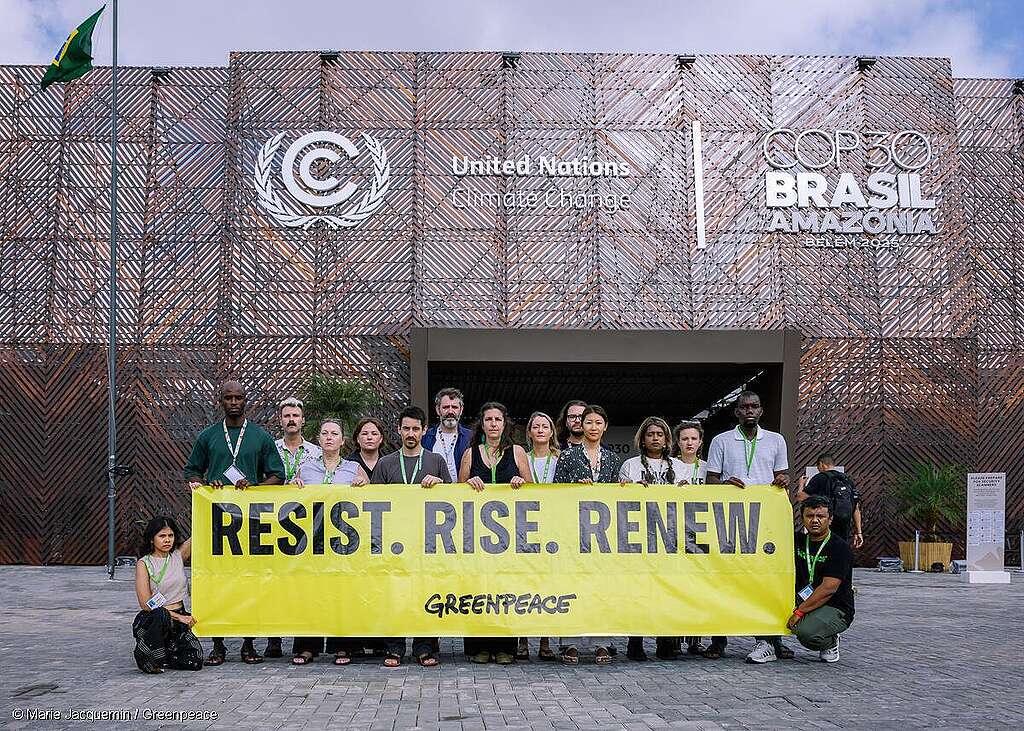 Ob koncu COP30 je Greenpeace poslal sporočilo s pročelja prizorišča COP30 s transparentom, na katerem je pisalo: »Uprite se – Vstanite – Obnovite« (angleško: “Resist – Rise – Renew”).
