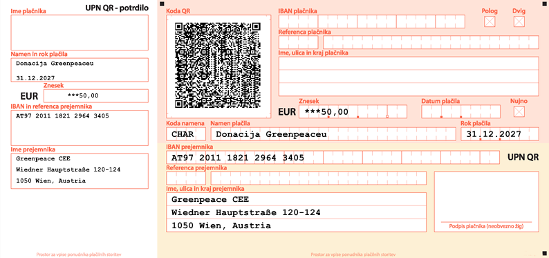 Dodatna pojasnila: V Sloveniji je organizacija Greenpeace zastopana pod imenom Društvo Prihodnost, v globalni shemi organizacije pa smo del regije Greenpeace v srednji in vzhodni Evropi (Greenpeace Central and Eastern Europe, ali krajše Greenpeace CEE) s sedežem na Dunaju. Finančno – administrativne zadeve urejamo preko matične pisarne, zato se tudi donacije naših podpornikov nakazujejo na transakcijski račun pisarne v Avstriji (kontaktne informacije najdete tukaj). Večina pisarn v regiji za donacije uporablja enako spletno platformo (povezava je navedena zgoraj pod točko 1), ki uporabnikom omogoča povsem varno, brez dodatnih stroškov, hitro in enostavno donacijo, organizaciji pa zaradi digitalnega poteka procesa skoraj popolno avtomatizacijo, posledično tudi manj administrativnega dela. Velja tudi izpostaviti dejstvo, da je varnost vaših plačilnih podatkov preko tega našega sistema povsem varna, saj jih prejemniki ne moremo pridobiti ali shraniti. Podatki so v celoti sprocesirani preko plačilnega sistema Adyen, ki mu zaupajo tudi drugi spletni ponudniki, kot so eBay, Booking.com, Netflix, Spotify in drugi.