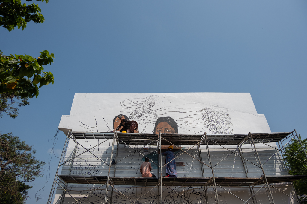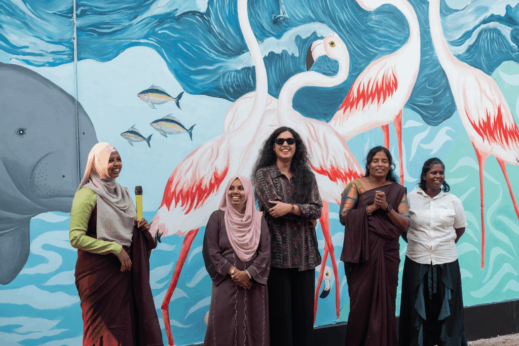 And once again, they listened to one another. The mural began to hold what had been shared. Women in dialogue. Women in labour. Women connected to land and sea. Mangroves, birds, palmyrah, water. Not as decoration, but as life.
