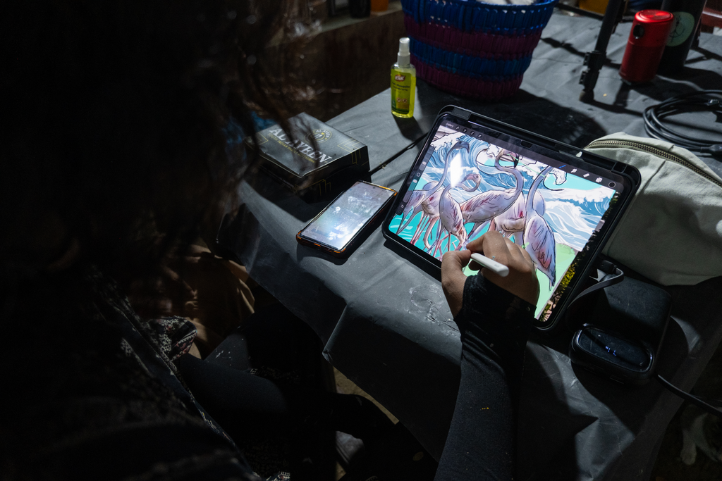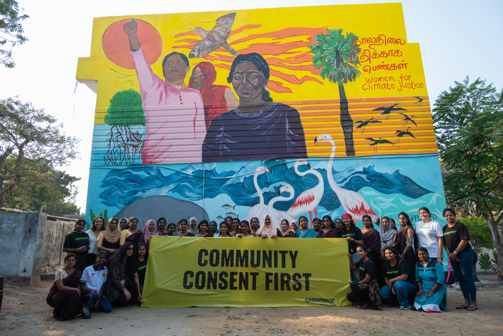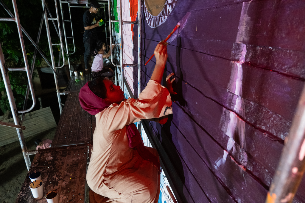 They were joined by a group of incredible youth volunteers and the Greenpeace team, who stayed with the process for hours, working alongside the artists, painting, filling, and holding the pace of the wall. The wall became a place of gathering. People stopped to watch. Children stood close. Conversations continued in paint.