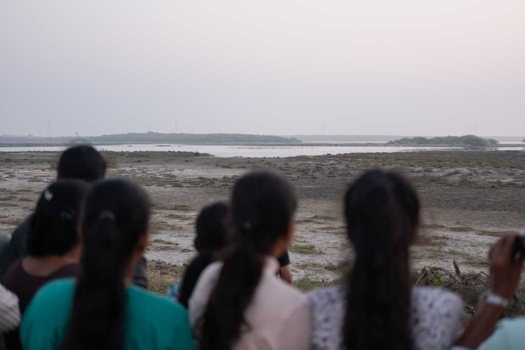 Before the heat settled in, the women travelled out together to Vankalai Bird Sanctuary. This time, not to sit in circles, but to step into the land itself. The light was still soft when they arrived. Flamingos stood in the distance, scattered across the water like quiet markers.
