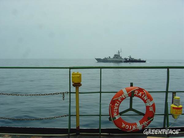 We were running out of food (environmental activists have a rather good appetite, you know). So, on the 20th of October we were told we could approach the port and take food supplies (by boat). The government had apparently allowed us to enter the anchorage and resupply. Walter, our excellent cook, had big dreams of tomatoes and vegetables and curry and soup, which were shattered by two Indonesian navy vessels on the horizon. If only the government could act as quickly on stopping deforestation as they did in getting the navy ships to visit us.