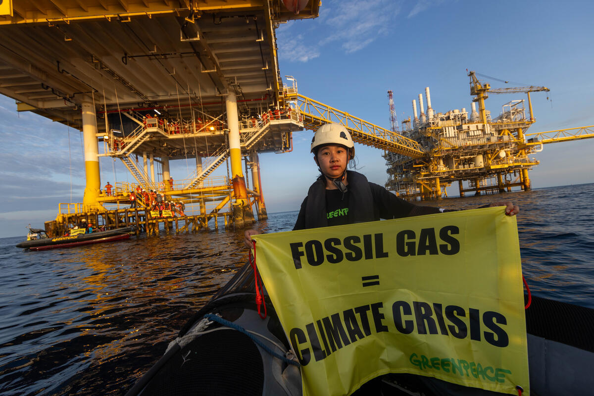 Greenpeace activists scale fossil gas platform in Gulf of Thailand to challenge offshore carbon capture scam