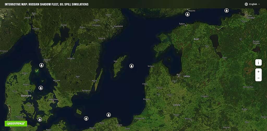 Bild av Greenpeace interaktiva karta som visar oljespillssimuleringar i Östersjöområdet