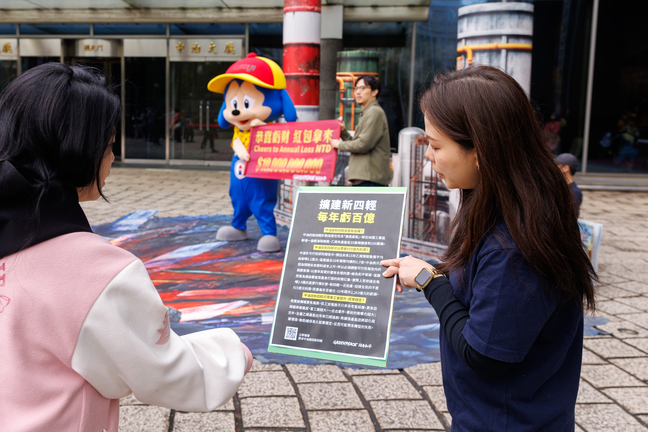 為阻止「新四輕」帶來的衝擊,綠色和平於行動現場以中油總部為背景,設置大型石化廠外觀與「燃燒公帑」的錢坑裝置,並帶來自製的「中油狗」與路過的民眾互動,邀請民眾一起將千元假鈔投入錢坑中,一旁布條寫著「恭喜虧財,紅包拿來」、「年虧百億」,諷刺中油在連年虧損未止之際,仍推動恐加劇虧損的「新四輕」案。