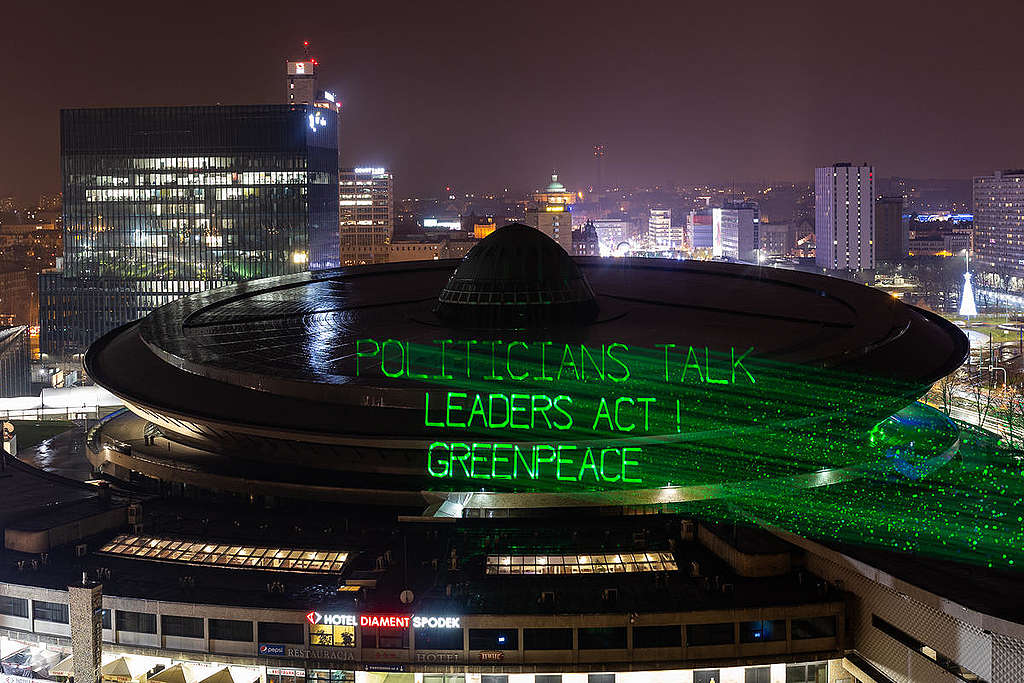 在這一連串拯救地球的行動中,綠色和平也沒缺席。九位綠色和平行動成員,在波蘭氣候會議開幕前一刻,爬上全球最大的燃煤電廠集團之一波蘭能源集團股份公司(PGE)位於波蘭中部的燃煤電廠煙囪,展示「拯救氣候」(save the climate)標語。同一時間,綠色和平在各大城市也發起一系列行動,要求各國政府檢討燃煤發電政策,訴求政治領袖兌現減碳承諾,發展潔淨再生能源,挽救氣候變遷災害。