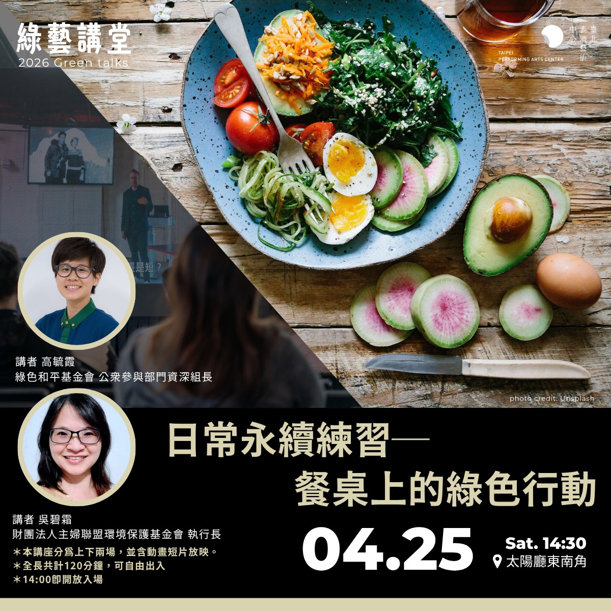《綠藝講堂 Green Talks》是北藝中心以永續為核心議題的講座活動,期望透過不同領域的專家,帶你從日常生活出發,找到屬於你的永續實踐方式。從今天這一餐開始,一起練習永續日常🌍