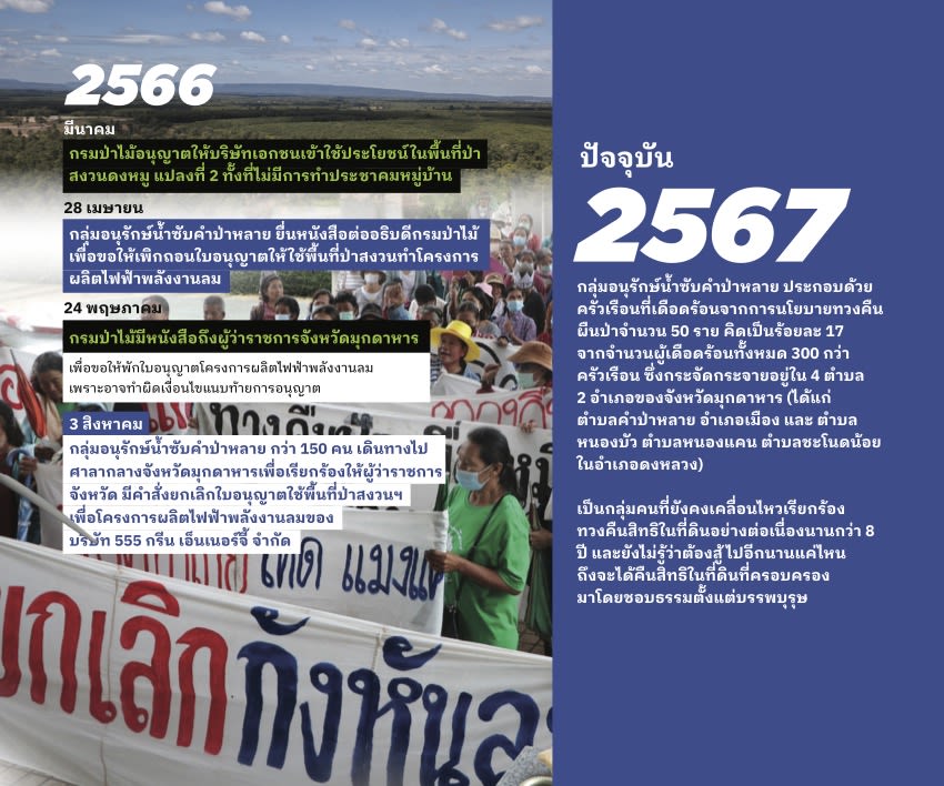 "คำป่าหลาย" คือชื่อตําบลหนึ่งในจังหวัดมุกดาหาร ห่างจากเมืองเพียง 25 กิโลเมตร มีภูมิประเทศเป็นภูเขาสูงติดกับเทือกเขาภูพาน มีสภาพเป็นที่ราบลุ่มเหมาะแก่การท่านาและเป็นที่อยู่อาศัย ชาวบ้านที่นี่พึ่งพิงป่า เพราะป่าเป็นแหล่งอาหารตามธรรมชาติ และยังเป็นแหล่งป่าต้นน้ําที่มีลักษณะ เฉพาะ คือมีแหล่งน้ําซับซึมผุดขึ้นจากหินทราย เป็นหย่อม ๆ หลายแห่ง เป็นแหล่งน้ํากินน้ําใช้ของ คนทั้งในพื้นที่และพื้นที่ใกล้เคียงตลอดทั้งปี อย่างไม่เคยเหือดแห้ง ทั้งเป็นต้นกําเนิดของลําห้วย น้อยใหญ่ ก่อนไหลลงสู่แม่น้ําโขง