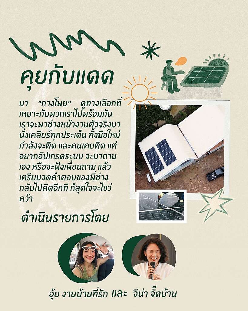 ถ้าคุณเคยคิดว่า “ค่าไฟแพงขึ้นอีกแล้วเหรอ…” “โซลาร์มันติดยังไงนะ” “การใช้พลังงานของโลกเรามันจะไปทางไหนกันแน่” หรือแค่อยากใช้เวลากับคนที่คุณรัก มีแสงแดด มีลม มีกลิ่นหอม มีดนตรี มีของเล่น เราอยากชวนมางานนี้