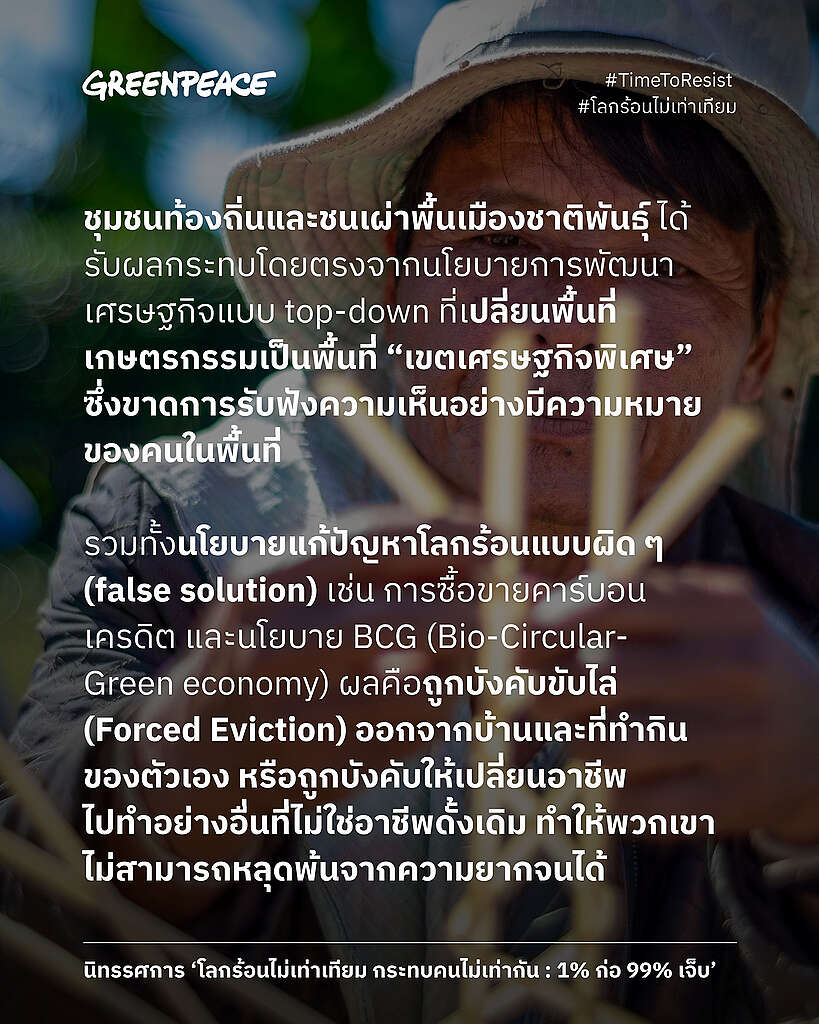รวมทั้งนโยบายแก้ปัญหาโลกร้อนแบบผิด ๆ (false solution) เช่น การซื้อขายคาร์บอนเครดิต และนโยบาย BCG (Bio-Circular-Green economy) ผลกระทบที่เห็นได้ชัดเจนที่สุดที่เกิดขึ้นกับคนกลุ่มนี้คือการถูกบังคับขับไล่ (Forced Eviction) ออกจากบ้านและที่ทำกินของตัวเอง หรือถูกบังคับให้เปลี่ยนอาชีพไปทำอย่างอื่นที่ไม่ใช่อาชีพดั้งเดิมที่ทำมาตั้งแต่บรรพบุรุษ ทำให้วิถีชีวิต ความหลากหลายทางวัฒนธรรม อาชีพ และองค์ความรู้ท้องถิ่น รวมถึงความหลากหลายทางชีวภาพหายไป ซ้ำร้ายการที่รัฐพรากที่ดินจากพวกเขาไปภายในนาม “การพัฒนาที่ยั่งยืน” ทำให้พวกเขาไม่สามารถหลุดพ้นจากวงเวียนความยากจนไปได้เลย