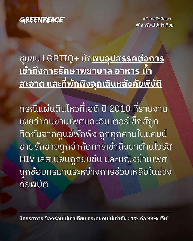 ผลกระทบรุนแรงจากโลกร้อนและการสูญเสียความหลากหลายทางชีวภาพ ผลลัพธ์คือถูกซ้ำเติมด้วยความเหลื่อมล้ำ ผู้คนจำนวนมากต้องสูญเสียโอกาสในการดำรงชีวิตอย่างปลอดภัยในสิ่งแวดล้อมที่ดี