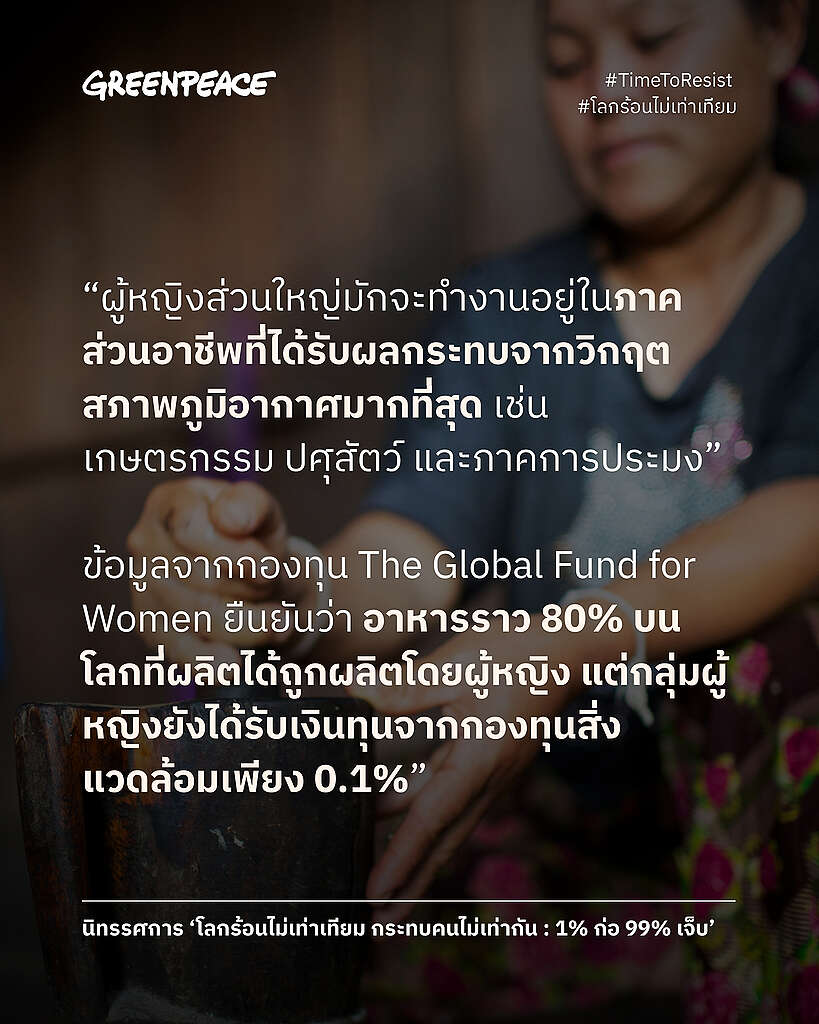 จากบทความของสำนักข่าว The Guardian ระบุว่า “ผู้หญิงส่วนใหญ่มักจะทำงานอยู่ในภาคส่วนอาชีพที่มักได้รับผลกระทบจากการเปลี่ยนแปลงสภาพภูมิอากาศมากที่สุด เช่น ภาคเกษตรกรรม ปศุสัตว์ และภาคการประมง” และยังมีข้อมูลจากกองทุน The Global Fund for Women ที่ยืนยันว่า อาหารราว 80% บนโลกที่ผลิตได้ถูกผลิตโดยผู้หญิง แต่กลุ่มผู้หญิงยังได้รับเงินทุนจากกองทุนสิ่งแวดล้อมเพียง 0.1%