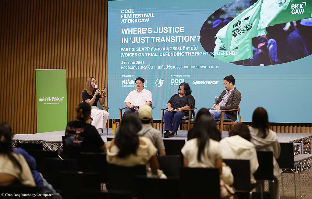 กรีนพีซ ประเทศไทย หยิบยกประเด็นเสรีภาพที่ถูกปิดกั้นนี้มาชวนทุกคนร่วมหาคำตอบเมื่อ 4 ตุลาคม 2568 ผ่านเวทีสนทนาในประเด็น ‘SLAPP กับความยุติธรรมที่หายไป (Voices on Trial: Defending the Right to Defend)’ ซึ่งเป็นส่วนหนึ่งของงาน Bangkok Climate Action Week (BKKCAW) ที่กรีนพีซต้องการสะท้อนให้เห็นถึง โลกร้อนไม่เท่าเทียม กระทบคนไม่เท่ากัน ขณะที่ 1% ก่อ 99% เจ็บ โดยที่ 1% ของกลุ่มผู้มีอำนาจนั้น สามารถใช้อำนาจที่มิชอบผ่านกระบวนการยุติธรรมทางกฎหมายมาสร้างความชอบธรรมในการริดรอนสิทธิของประชาชน 99% ได้ แม้จะอ้างว่าใช้สิทธิอันชอบธรรมทางกฎหมายแต่ในมุมของนักปกป้องสิ่งแวดล้อมคือความไม่เป็นธรรม อีกทั้งยังทำให้พื้นที่การใช้สิทธิในเสรีภาพการแสดงออกและการส่งเสียงของประชาชนหดตัวลง